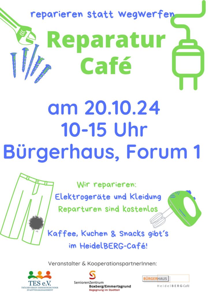 „Reparieren statt wegwerfen“ so lautet das Motto des beliebten Reparaturcafés im Bürgerhaus-Foyer! Ehrenamtliche Profis reparieren wieder Elektrogeräte, Haushaltsgeräte und Kleidung. Ehrenamtliche Fachleute reparieren die Gegenstände kostenlos, freuen sich jedoch über eine Spende!