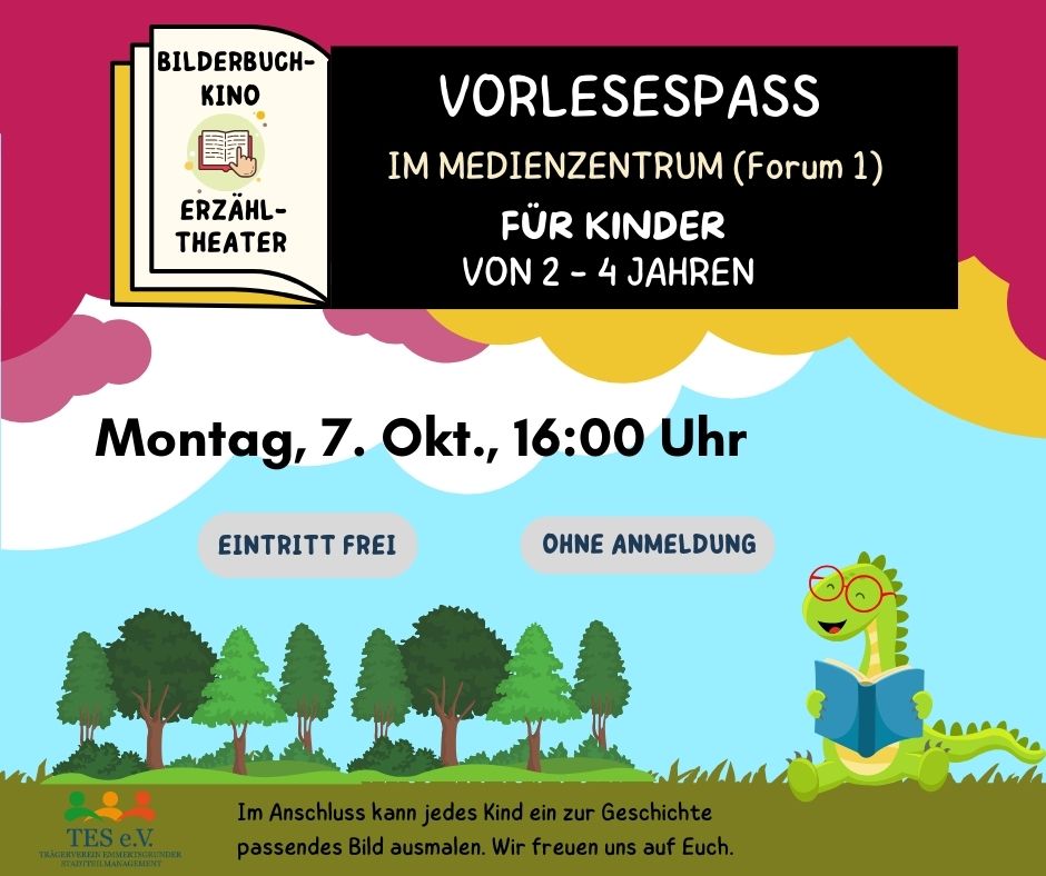 Einmal pro Monat lesen Ehrenamtliche im Medienzentrum Kindern im Alter von 2 bis 4 Jahren in gemütlicher Atmosphäre aus spannenden Bilderbüchern vor. Im Anschluss kann jedes Kind ein zur Geschichte passendes Bild ausmalen oder auch einfach in den Bücherkisten des Medienzentrums stöbern.