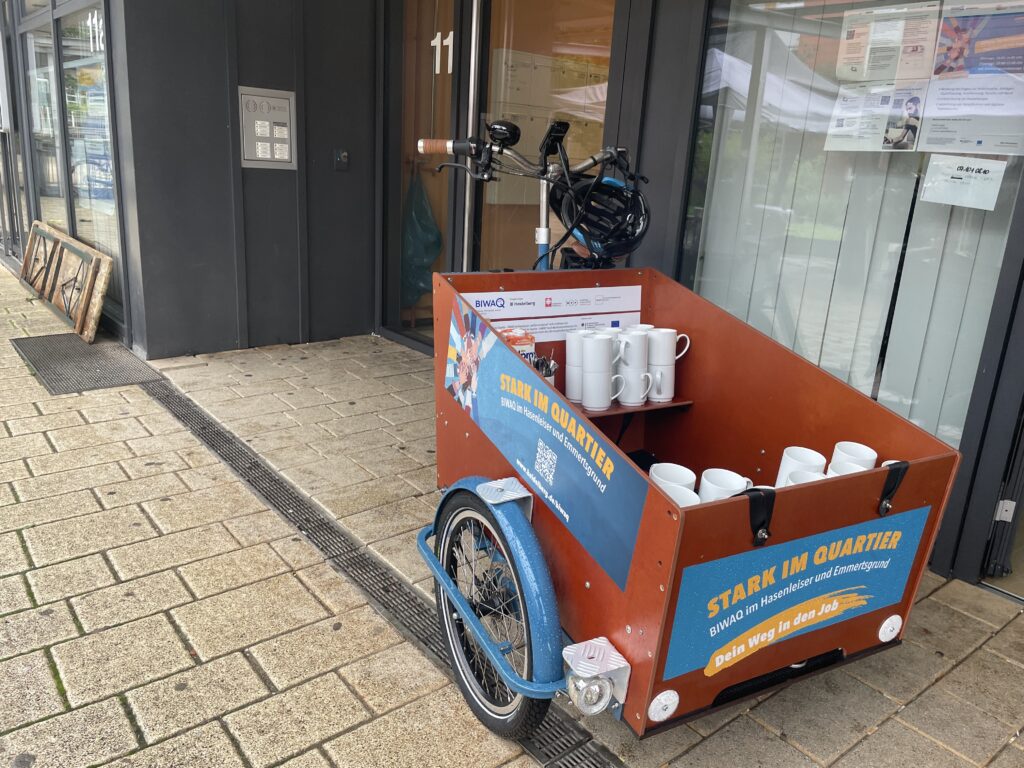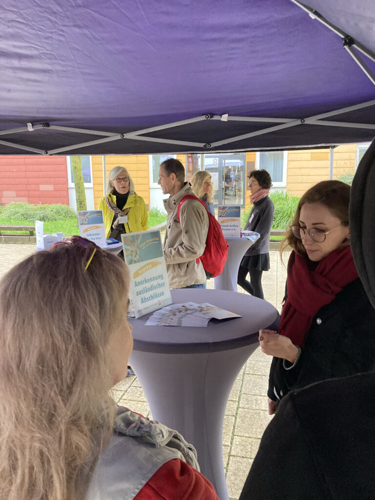 Trotz des feuchtkalten Wetters nutzten zahlreiche Menschen aus dem Emmertsgrund und anderen Stadtteilen die Gelegenheit, mit Unterstützungsangeboten und Arbeitgeber*innen in Kontakt zu kommen, kostenlos Bewerbungsfotos erstellen zu lassen und das Team des Projektes „Stark im Quartier – BIWAQ im Hasenleiser und Emmertsgrund“ kennenzulernen.