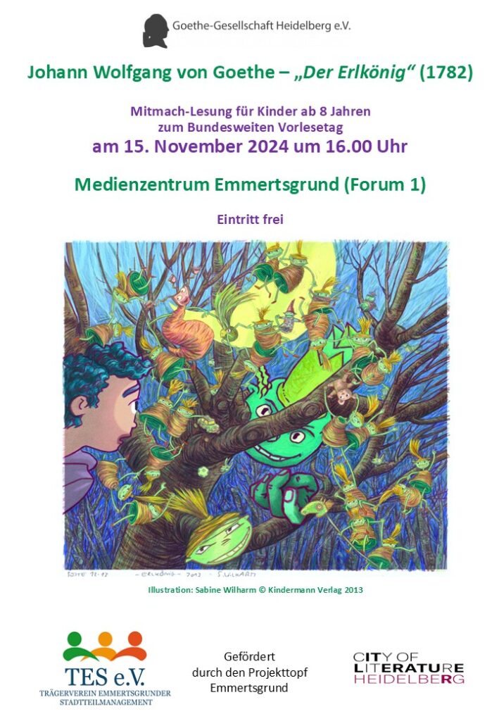 Am 15. November stellt Dr. Magali Nieradka-Steiner um 16.00 Uhr im Medienzentrum Emmertsgrund (Forum 1, 69126 Heidelberg) Goethes berühmte Ballade „Der Erlkönig“ vor. Die Mitmach-Lesung anlässlich des Bundesweiten Vorlesetages ist für Kinder ab 8 Jahren. Erwachsene sind natürlich auch herzlich willkommen. Und jeden Gast erwartet eine kleine Überraschung! Der Eintritt ist frei.