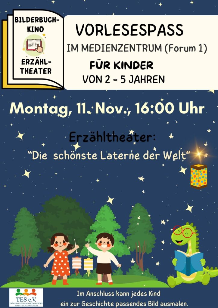 Der nächste Vorlesespaß für Kinder im Alter von 2 bis 5 Jahren steht an. Ehrenamtliche im Medienzentrum lesen den jüngsten Bibliotheksbesucher*innen tolle Geschichten vor. Dieses Mal passend zu St. Martin „Die schönste Laterne der Welt“.
