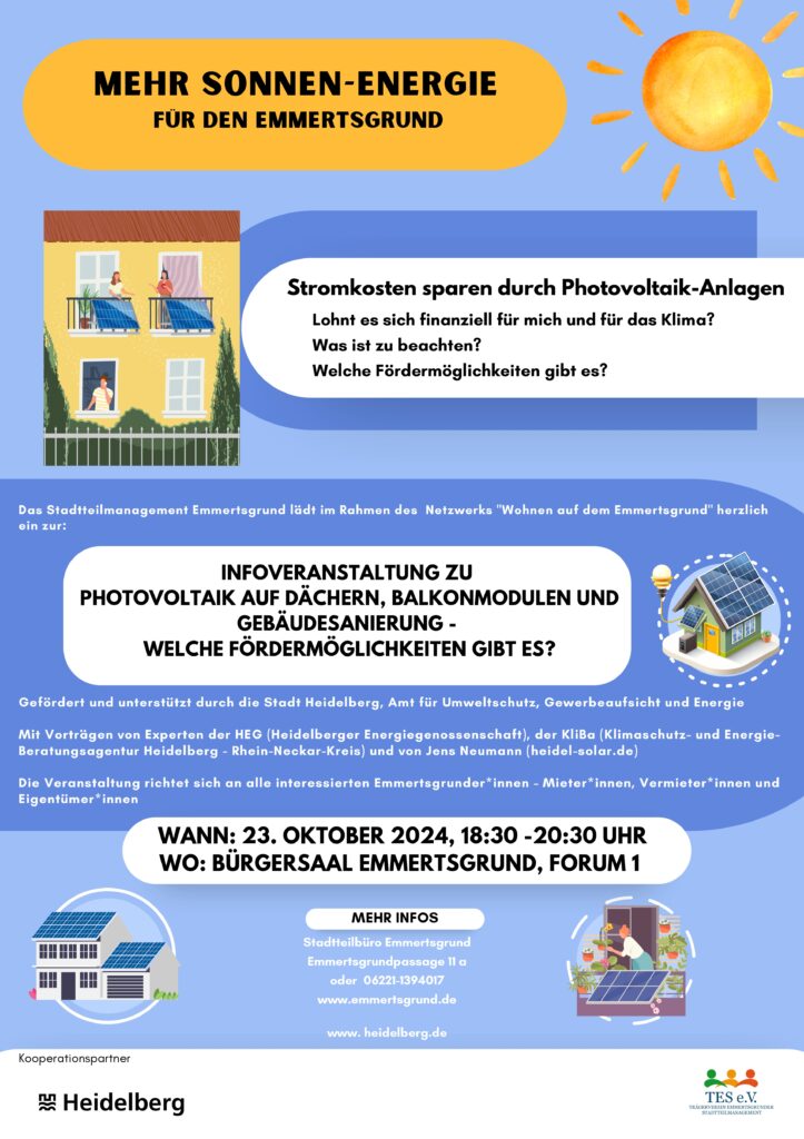 Gefördert und unterstützt wird die Infoveranstaltung durch die Stadt Heidelberg, Amt für Umweltschutz, Gewerbeaufsicht und Energie und richtet sich an alle interessierten Emmertsgrunder*innen – Mieter*innen, Vermieter*innen und Eigentümer*innen